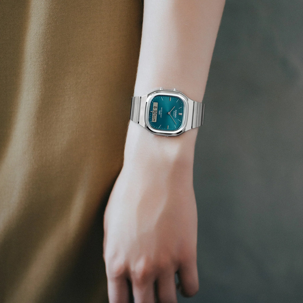 The analogue-digital AQ-240 with dual display goes retro-modern. With a slightly rectangular face offset by a gently rounded case and soft metal curves, this watch exudes sophistication.